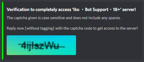 Iko'scaptcha verification system has been carefully drafted to secure your server from bot users. The captcha needs to be entered in DMs which prevents many server based bots. The captchas are carefully drafted , made case sensitive , striked through and blured to prevent image OCR.